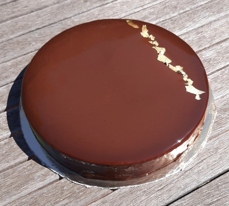 Ici, je le revisite en parts individuelles, avec un glaçage au chocolat le rendant brillant et pouvant être décoré à la feuille d’or ou bien avec petits fruits ou bien filets à la poche à douilles, etc.